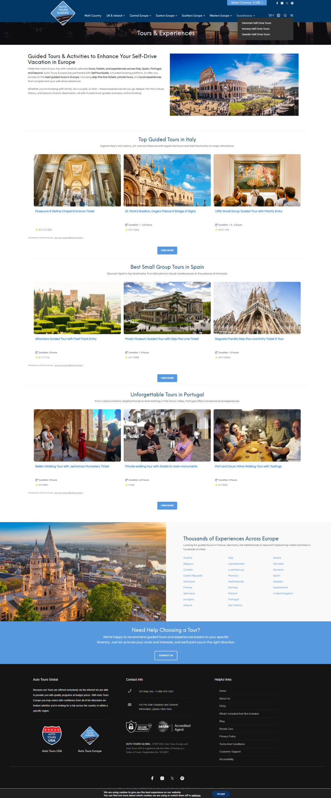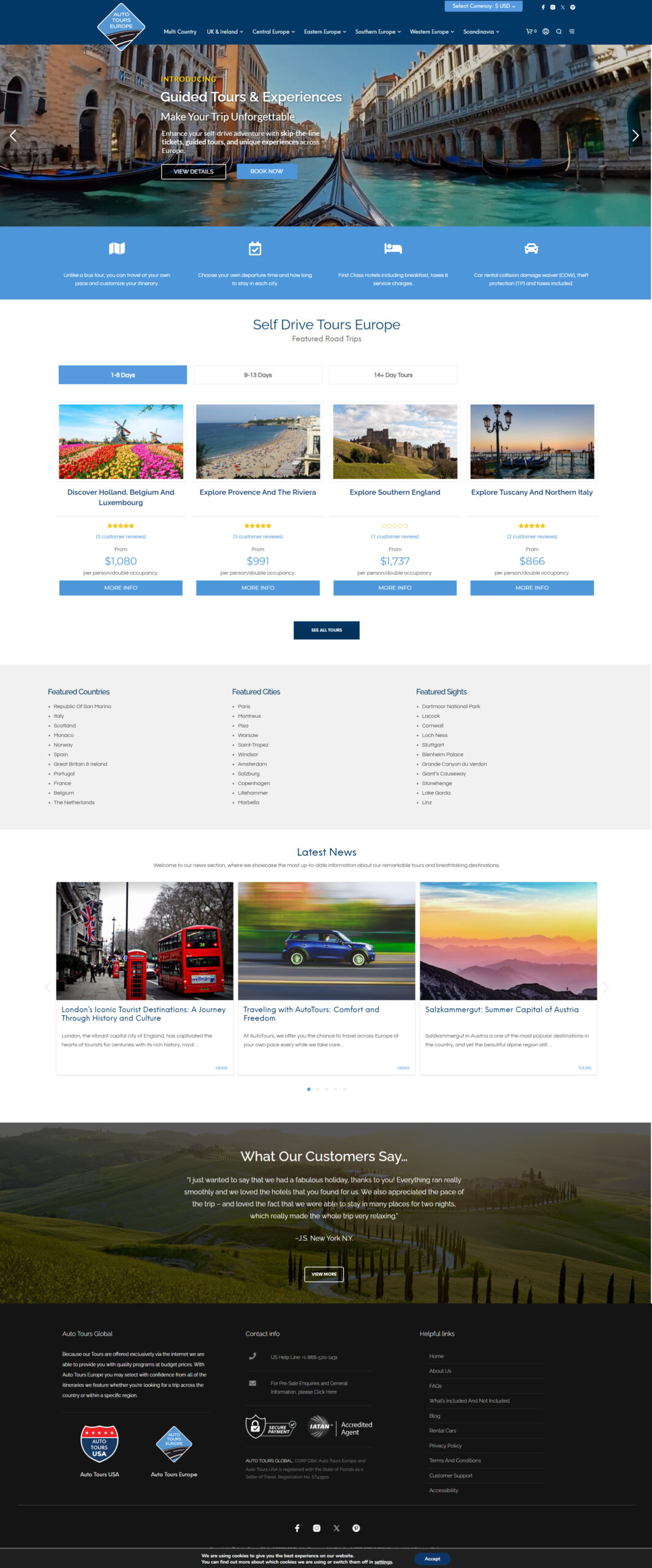 Auto Tours Europe focuses on immersive, multi-country itineraries. The design emphasizes clarity and readability to support complex travel planning, while pricing is clearly displayed in relevant currencies to accommodate international travelers. Auto Tours Europe uses dark blue paired with a lighter blue to convey trust, clarity, and a sense of exploration, supporting complex itineraries within a calm, cohesive visual system.