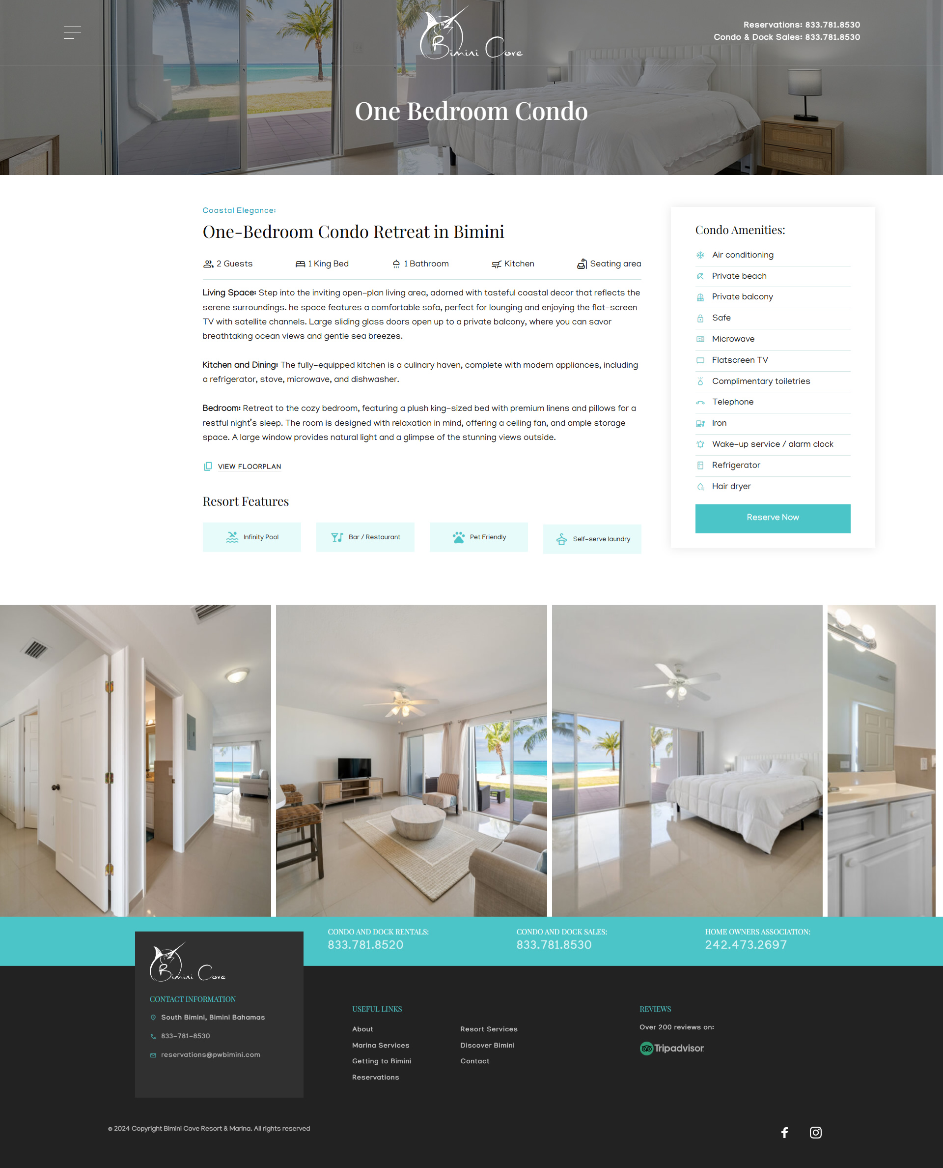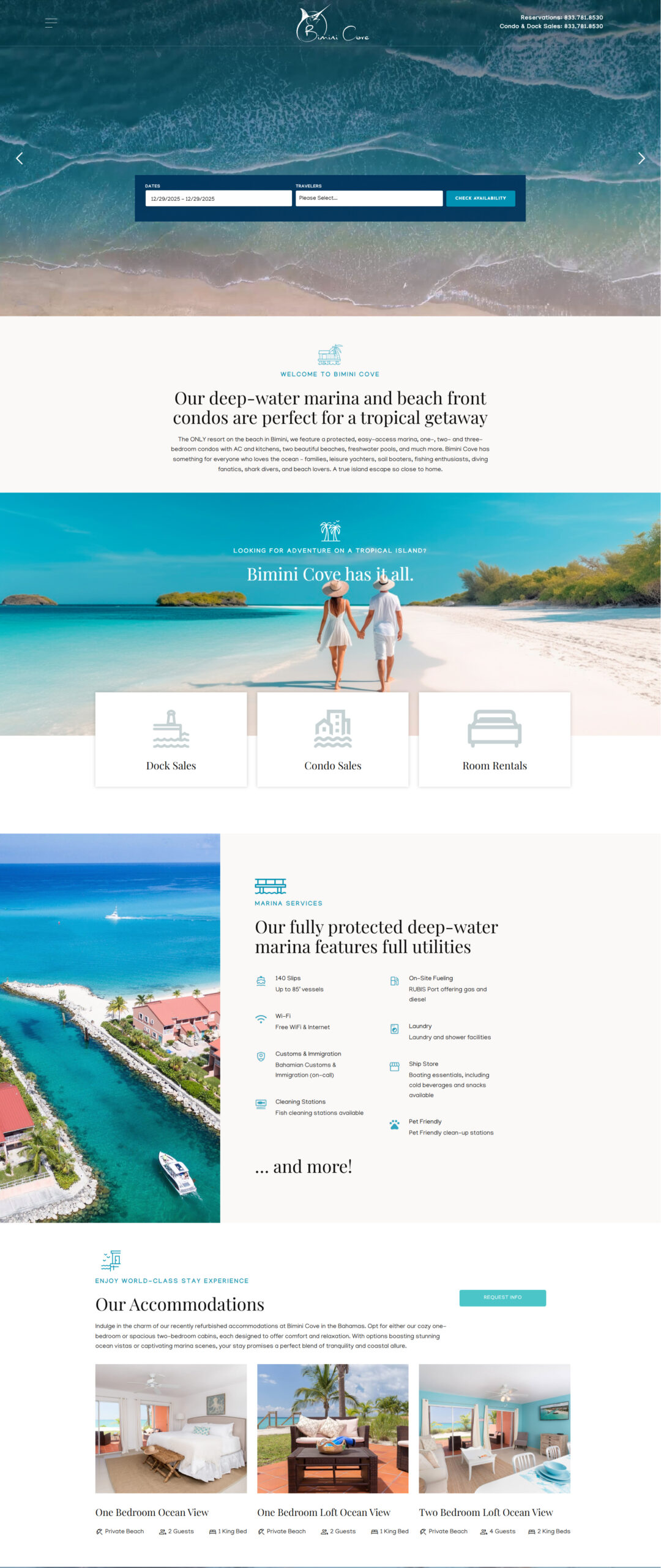 A dedicated accommodations section presents one-, two-, and three-bedroom condos with ocean or marina views, complete with amenities like air conditioning, full kitchens, balconies, and private beaches. The booking flow guides users through selecting dates, viewing options, and confirming reservations with clear steps and minimal friction.