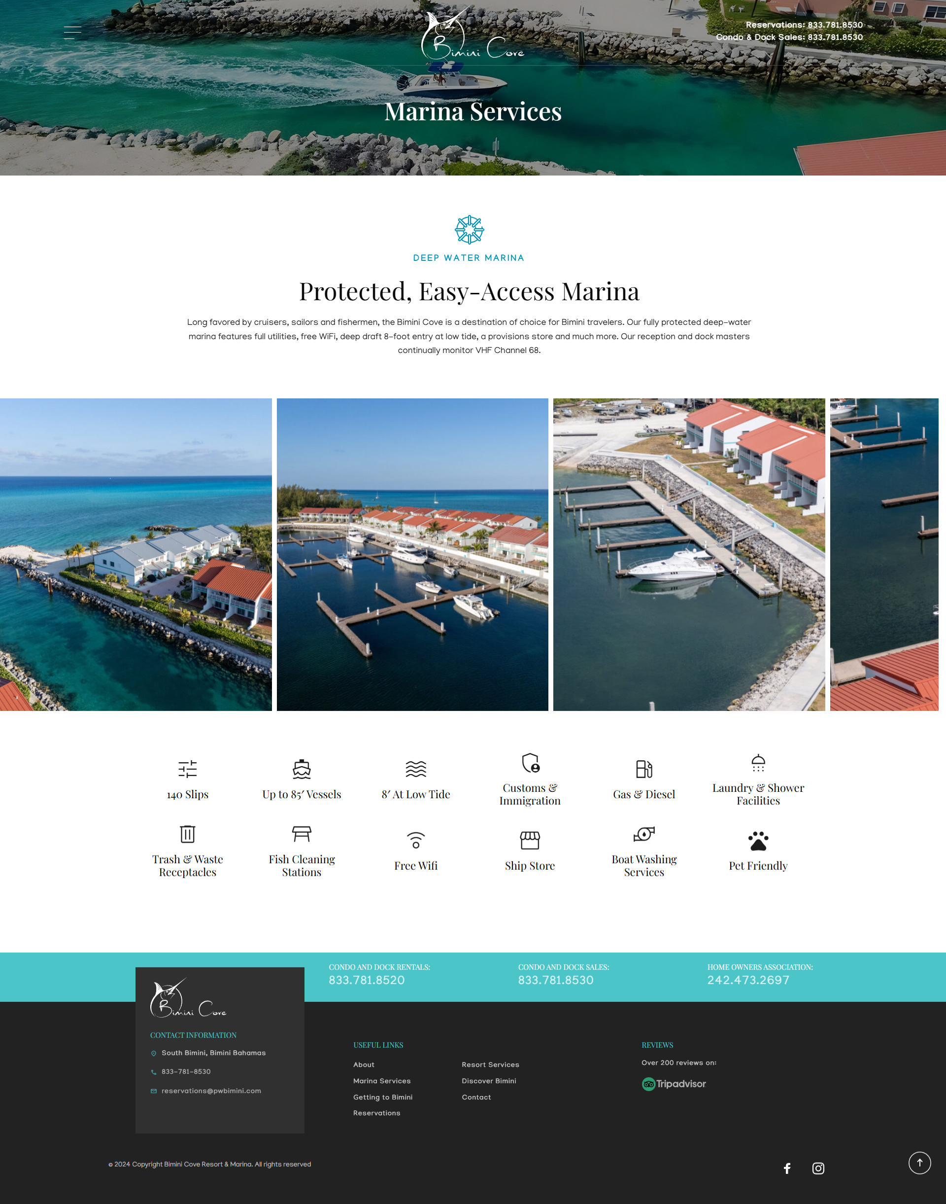 A dedicated section highlights the deep-water marina with 140 slips, laundry and shower facilities, gas and diesel fuel, fish cleaning stations, and free Wi-Fi, ideal for boaters and travelers alike