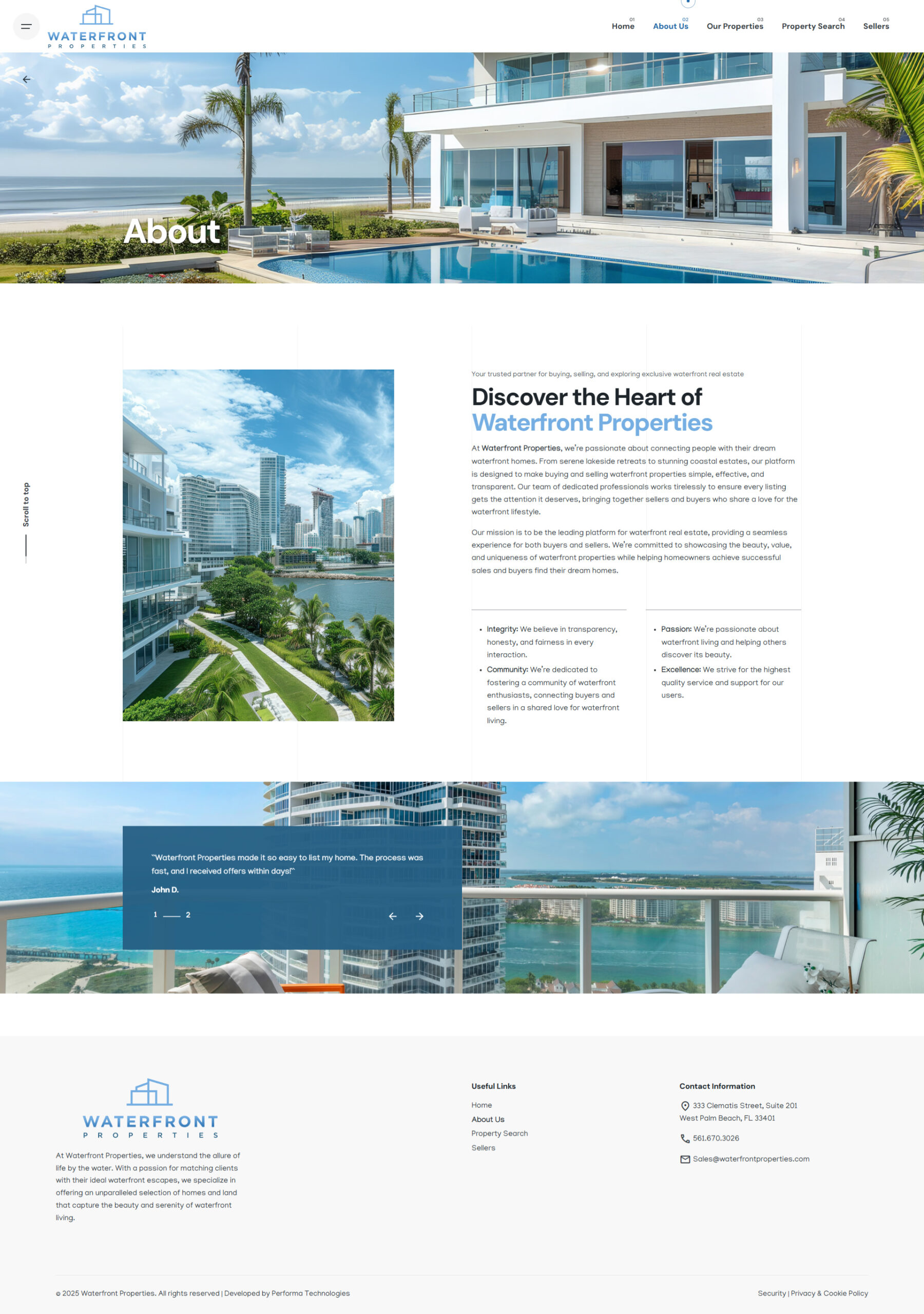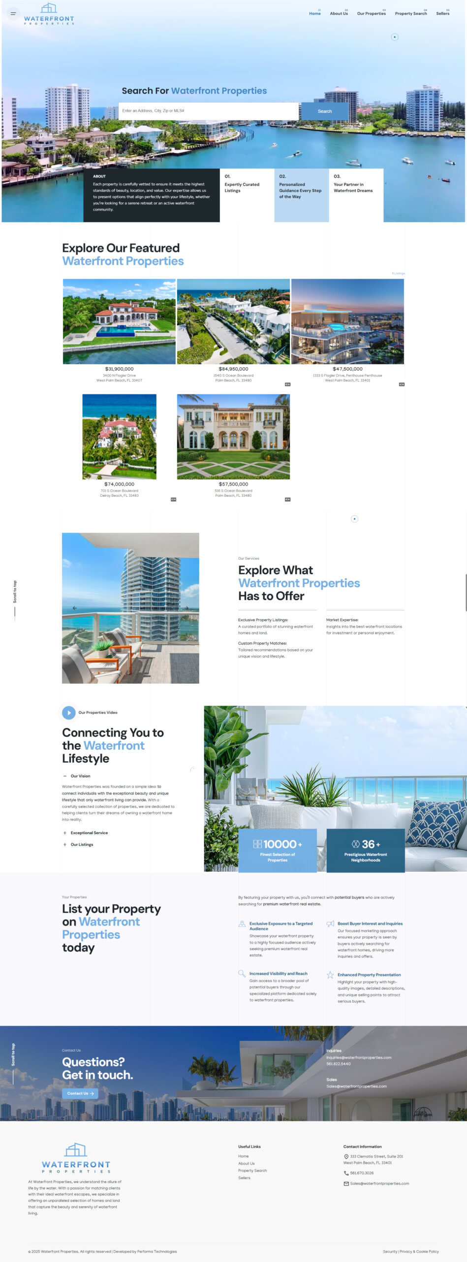 - About / Company Values: A section communicates the story of Waterfront Properties — their decades of experience, local expertise, and commitment to waterfront living.