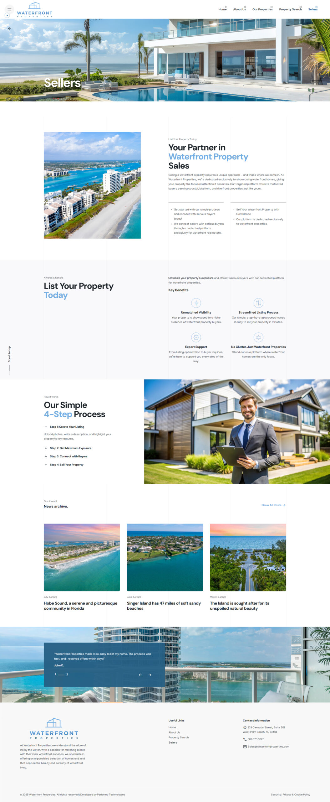 - Sellers Page: The “Sellers” section is tailored specifically for property owners, explaining their listing process, value proposition, and why Waterfront Properties is the right broker for waterfront homes.